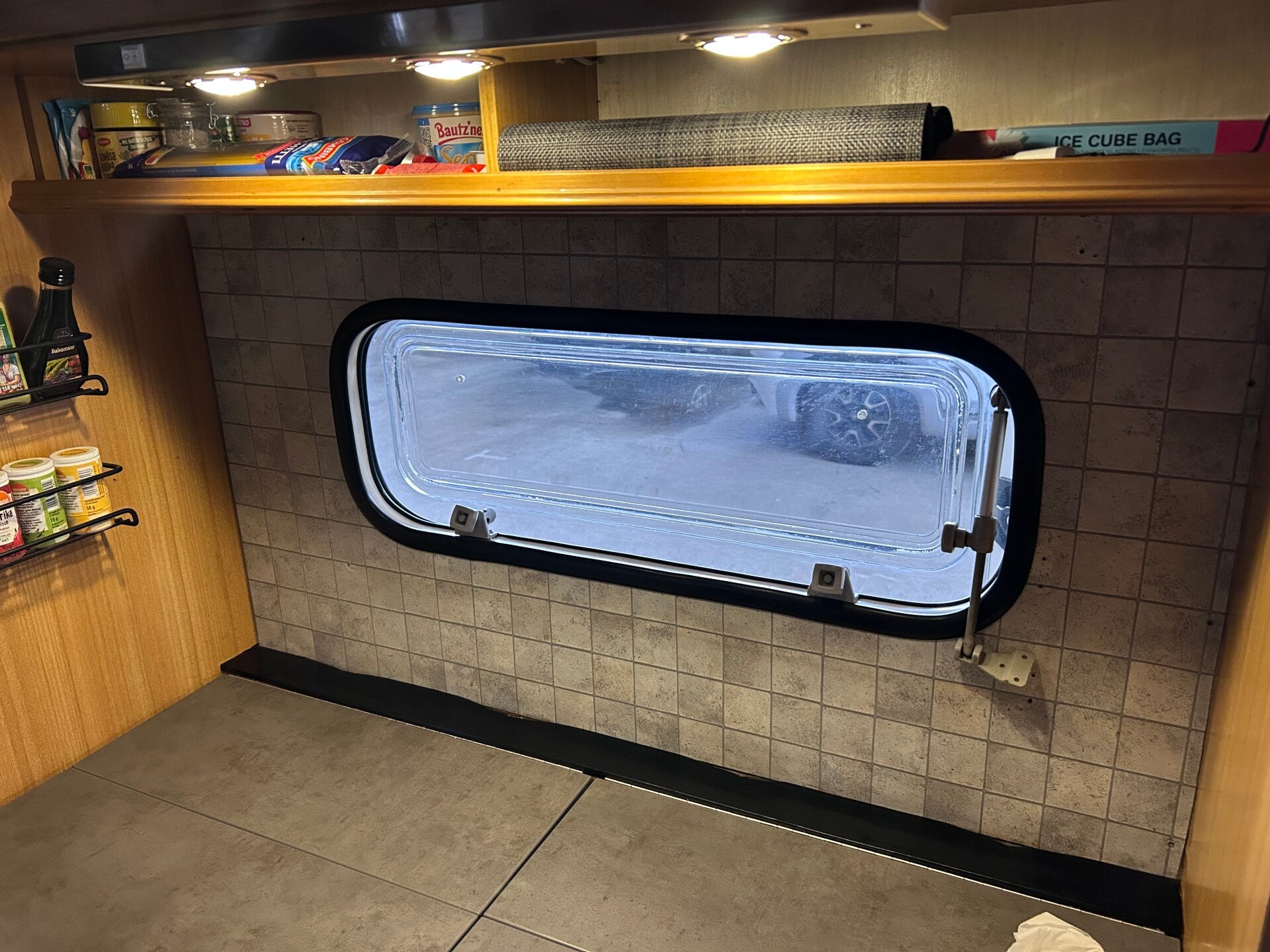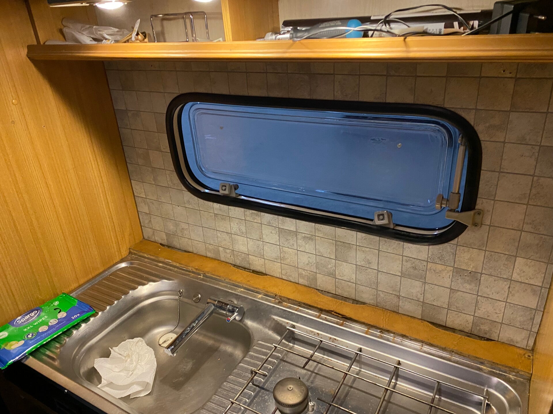 Die neue Abdeckung sowie die alten Wandfliesen sind im unteren linken Bild zu sehen. Da die alten Wandfliesen aus einer Art PVC bestanden, konnten wir sie nicht vollständig entfernen. Daher haben wir sie einfach überklebt. Außerdem haben wir einen neuen Verdunkelungs- und Insektenschutzrahmen eingebaut, da der alte Rahmen bereits stark abgenutzt war und das Verdunkelungsrollo nicht mehr zuverlässig an seinem Platz blieb.